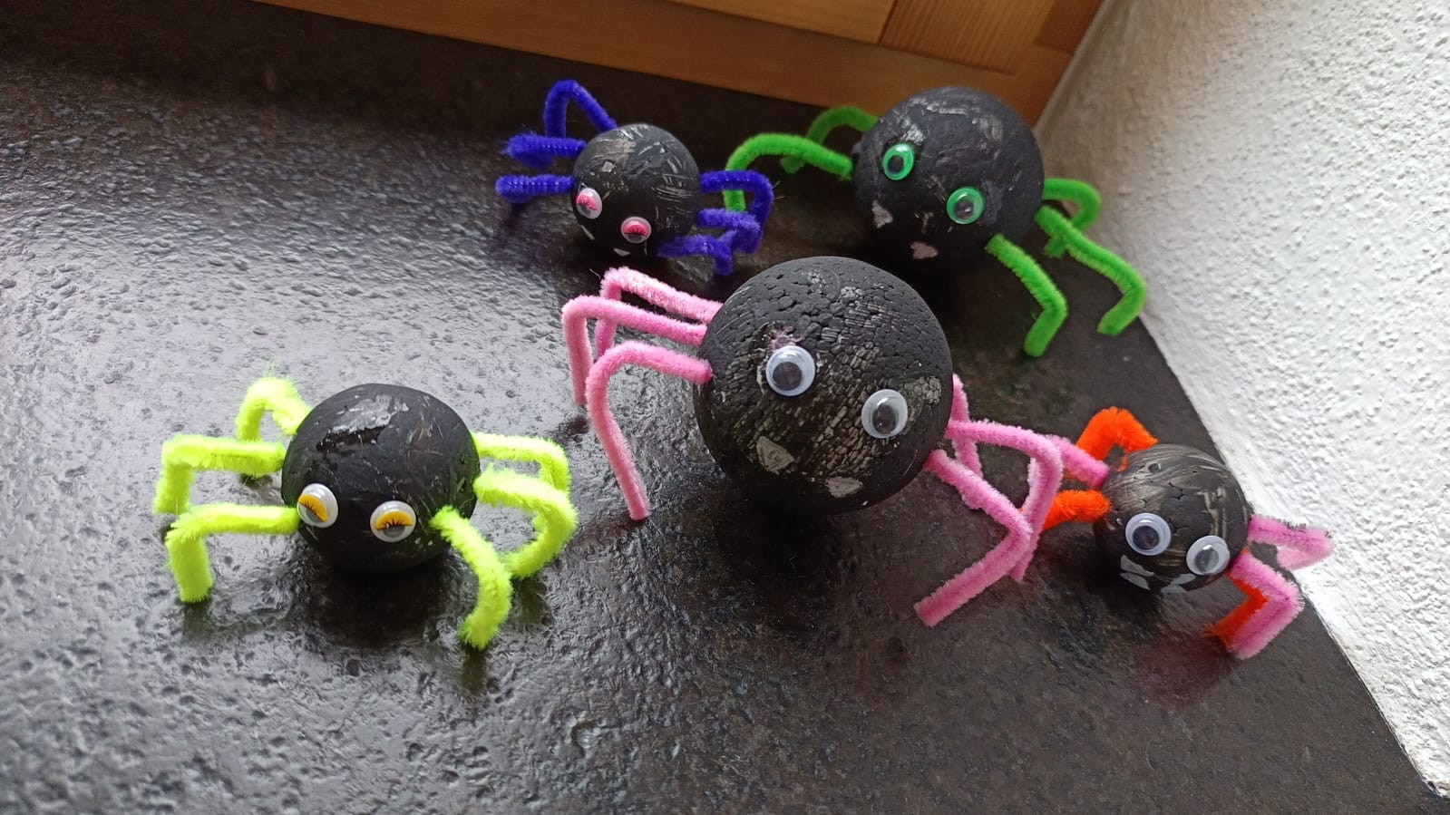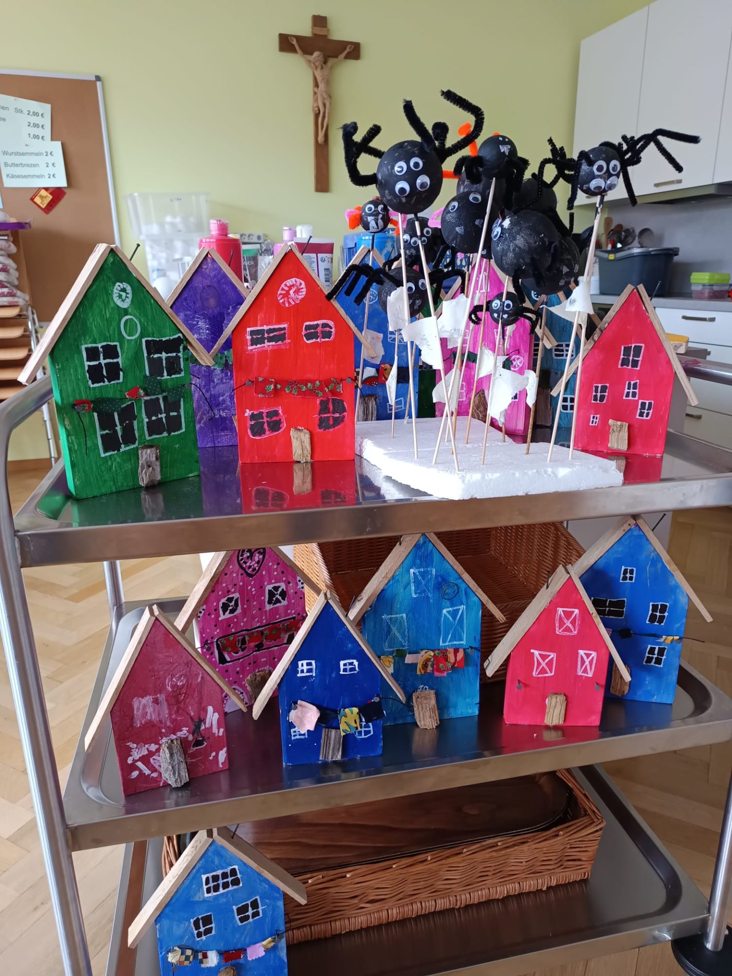 Innerhalb von rund zwei Stunden entstand ein aufwändiges Stück: Ein Holzhaus wurde bemalt, mit aufgemalten Fenstern versehen und erhielt zudem ein Dach, einen Kamin und eine Wäscheleine. Danach durften die Kinder noch aus einer Styroporkugel und Pfeifenputzern Spinnen basteln.
