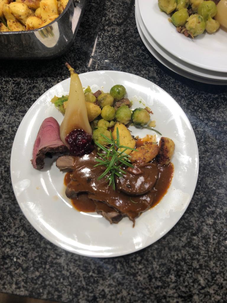 - Als Hauptspeise wurde eine geschmorte Rehkeule sowie eine rosa gebratene Rehhüfte, Wacholderrahmsoße, gefüllte Preiselbeerbirne, Speckrosenkohl und selbstgemachte Gnocchi serviert. Dabei erklärte er anschaulich die einzelnen Schritte bei der Zubereitung der jeweiligen Gerichte.