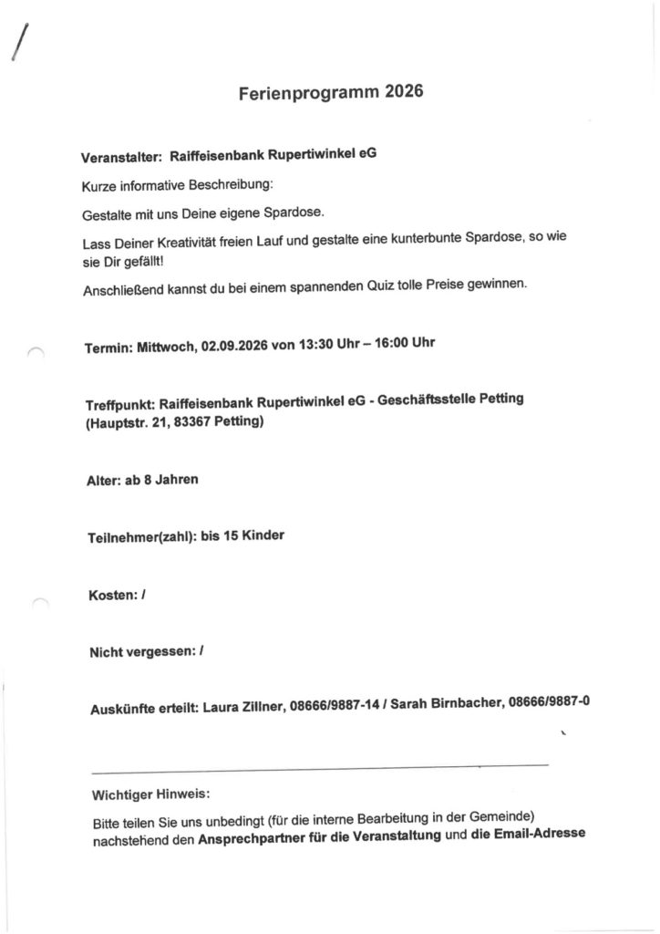 Ferienprogramm Raiffeisenbank Rupertiwinkel eG
