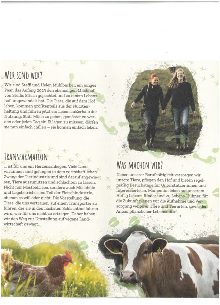 Wir wollen in einer Welt leben, in der alle Tiere ein Recht auf ein freies Leben haben, und versuchen auf unserem Hof diese Utopie Wirklichkeit werden zu lassen. Auf unserem Hof leben 13 Rinder und 22 Hühner. Sie sind keine Nutztiere, das heißt sie müssen weder Eier, noch Milch oder Fleisch produzieren. Sie dürfen einfach leben.
