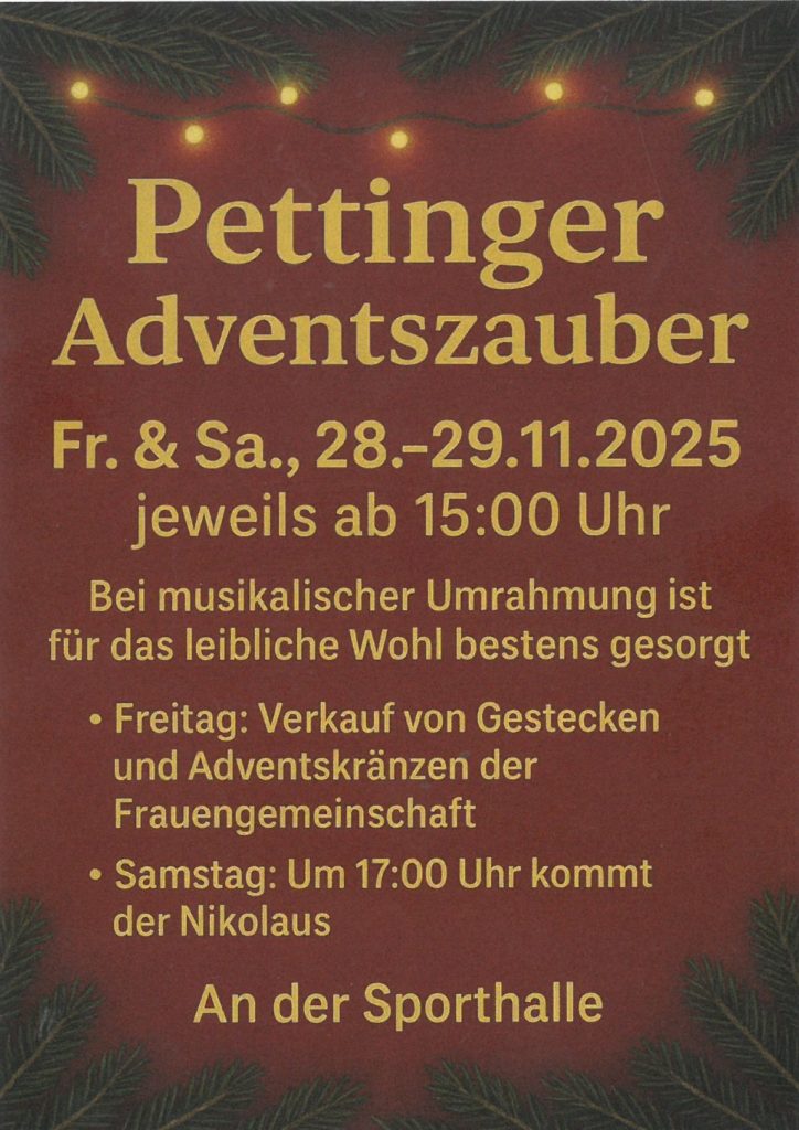Am Dorfplatz Pettinger Adventszauber mit Adventskranzverkauf und vieles mehr.